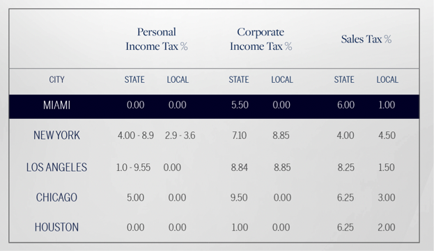 Floridas attractive tax structure is what ultimately drives its economy, made for corporations, professional bilingual work force, affordable office spaces, and modern logistical hubs, including: airports, ports, railroad systems, and highway infrastructures. The geopolitical location of Miami and the frequency of flights to all metropolitan cities in the U.S., and most international capitals, makes this metropolis appealing to companies for global business.