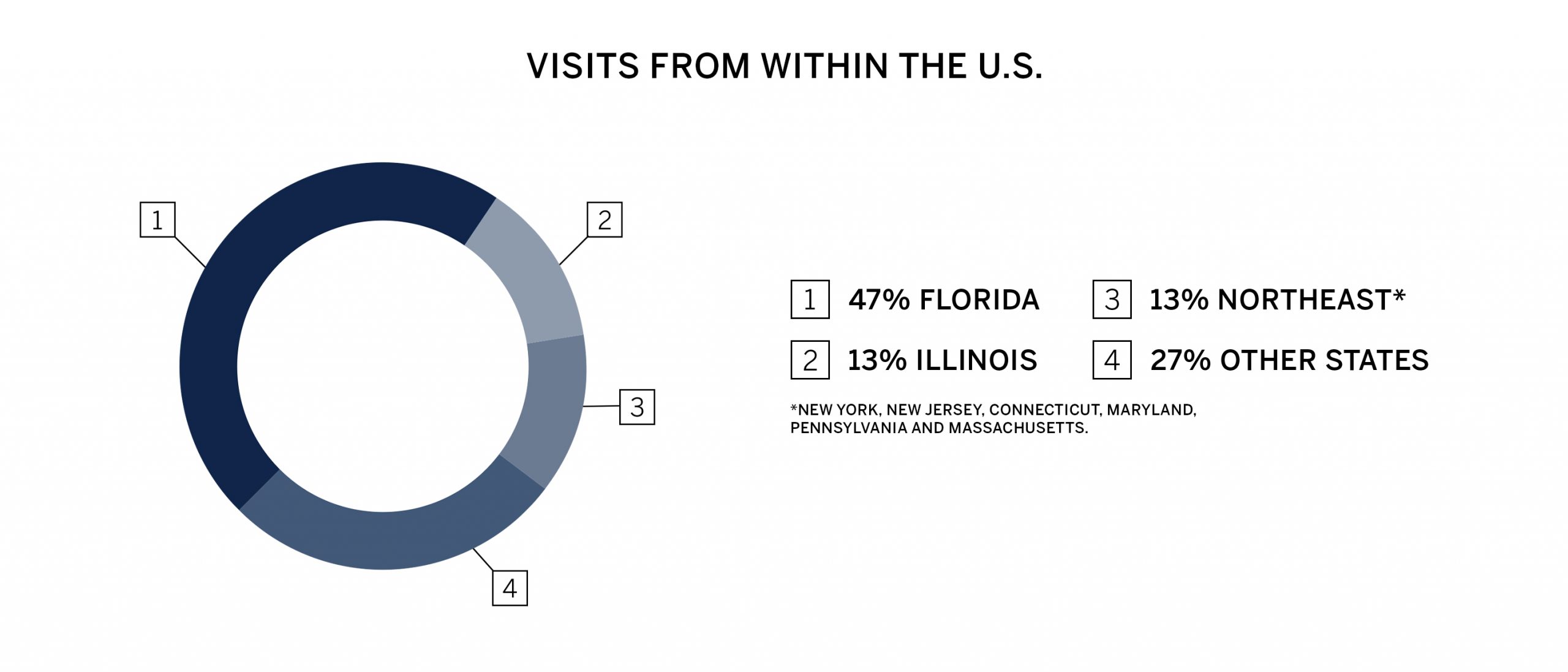 Historically, Canada is th top source of international buyers in Florida, followed by the UK (Central Florida), Brazil, Argentina, and Venezuela. Today, buyers from Mexico have been more active in the state, ranking #5 in the U.S. with 2.3 billion purchases in 2019. This trend is also reflected on the www.onesothebysrealty.com website. Here, Mexico represented 40% of the international digital footprint.