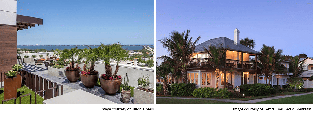 For a more intimate stay, the historic SeaGlass Inn Bed & Breakfast in Melbourne Beach offers the original Sunset Suite with spa tub and six charming Treehouse Cabana Rooms built around a grand oak. Guests can swim in the heated pool, ride complimentary bikes, or gather by the fire pit. Nearby, Port d’Hiver Bed & Breakfast combines historic charm with luxury amenities such as full beach set-ups (complete with coolers and boogie boards), gourmet breakfasts, wine hours, a fitness center, fire pit, and heated pool.